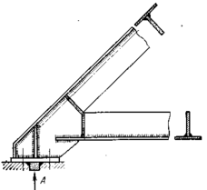Конструкции опорных узлов зависят от назначения ферм и устройств креплений. При конструировании опорных узлов ферм необходимо соблюдать следующие условия: направление реакции А должно проходить через центр опорного узла; сжатый пояс должен проходить над опорой, не прерываясь; узел должен обладать достаточной жесткостью (рис. 20.10).