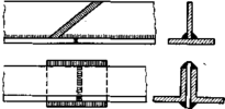 ные — их назначают в зависимости от условий транспорта и наличия подъемно-транспортных средств на строительстве. При монтаже элементы предварительно собирают на болтах или струбцинах; после этого производят сварку соединений. Положение монтажных стыковых соединений всегда назначает проектировщик. Наиболее целесообразны стыковые соединения с прямыми и иногда косыми швами (рис. 20.17,а, б). Эти типы соединений могут быть рекомендованы не только для уголковых и тавровых Рис. 20.17. Стыки поясов фермы профилей, но и для Н-образных,П-образных и других разновидностей поперечных сечений. Указанные типы стыковых соединений применяют при работе элементов на растяжение и сжатие, в особенности при переменных нагрузках.