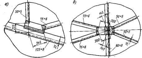 На рис. 20.12 изображены различные узлы трубчатых стержней, применяемых в фермах. Узлы предназначены для легких ферм. В некоторых из них допущены небольшие эксцентриситеты. Для усиления узлов поставлены накладки, ребра жесткости. Оригинальна конструкция, где элементы прикрепляются к сфере, формирующей узел. Другая группа узлов показана на рис. 20.13.
