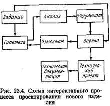 представлена на рис. 23.4. В каждой гипотезе предлагается модель объекта, являющаяся теоретическим и аналитическим представлением проекта. Эта модель анализируется в блоке «Анализ». Результаты анализа в блоке «Оценка» сравниваются с заданием, которое определяет цель проекта. При наличии отклонений с помощью блока «Изменение» модель можно откорректировать и затем повторить процесс анализа. За N шагов проект приближается к оптимальному. На последнем этапе проектирования разработчик приступает к конструкторской и технологической проработке проекта с выдачей технической документации на изготовление изделия.