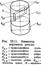 может быть плоской или криволинейной, связанной или несвязанной. Все точки связанной грани можно соединить линией, нигде не пересекающей границу грани. Связанная линия пересечения граней называется ребром R, а точка пересечения граней или ребер — вершиной V. На машиностроительных деталях ребрами служат чаще всего кривые — окружности, эллипсы (рис. 23.11).