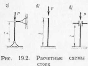 У стоек с защемленными концами (рис. 19.2,в), один из которых (нижний) неподвижен, а другой (верхний) обладает продоль ной подвижностью,