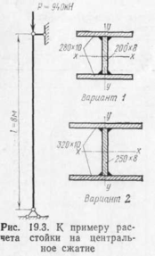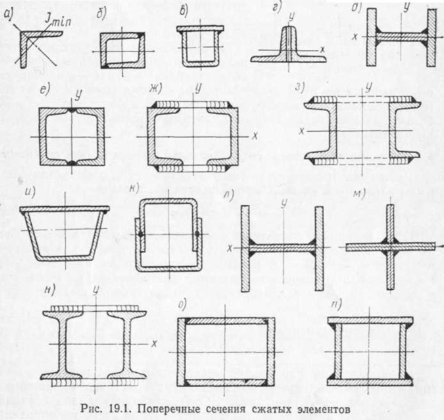 Для изготовления стоек, работающих при продольных усилиях до нескольких сотен килоньютон, применяют Н-образные профили (рис. 19.1,д), которые во многих случаях наиболее рациональны. Открытые швеллерные (рис. 19.1,ж, з) профили применяют, чтобы при наименьшей площади получить значительный момент инерции, трубчатые профили (рис. 19.1,е, и, к) иногда используют в станинах.