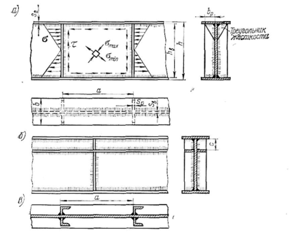 Ширину ребра, выраженную в миллиметрах принимают bР=hB/30+40, толщину sp≥bp/15. Расстояние между ребрами жесткости определяется значением напряжений и размерами балки.