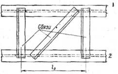 1. Ограничивать свободную длину изгибаемого элемента. Например, две параллельные изгибаемые балки 1 и 2 следует взаимно соединить связями на расстоянии l0 (рис. 18.4), особенно сжатые пояса. Такие связи ставят в подкрановых балках, мостовых кранах и т. п.