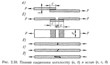 На рис. 2.33, б, г, д приведены примеры паяных соединений встык. Паяные прямые швы (рис. 2.33, в) не всегда могут быть рекомендованы для рабочих конструкций. Косые паяные (рис 2.33, г) швы обладают более высокой несущей способностью, особенно при угле скоса 45°. Зигзагообразные соединения (рис. 2.33, д) не могут быть признаны целесообразными. Они сложны в оформлении, а разрушение наступает по сечению, совпадающему с вертикальной плоскостью спая.