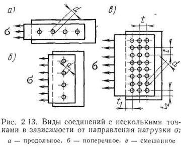 В сварном точечном соединении приняты следующие обозначения (рис. 2.13): d — диаметр точки; t—шаг точек; tх—расстояние от центра сварной точки до края детали в направлении действия силы Р; t2—расстояние от центра сварной точки до свободной кромки в направлении, перпендикулярном действию силы Р; t1 и t2 нормируются с учетом технологических и силовых факторов.