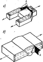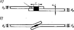 Рис. 2.59. Появление концентрации напряжений в соединениях с шовными швами: а — неравномерное распределение о по толщине; б — изгиб соединения