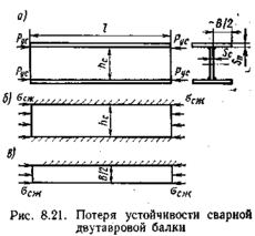 При сварке поясных швов (см. рис. 8.6). В балках в результате сварки возможна потеря устойчивости стенок или полок..
