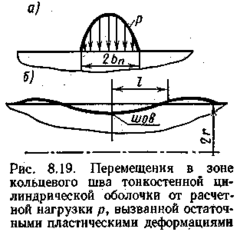 — радиус цилиндрической оболочки. В результате образуется местный изгиб и уменьшение диаметра в зоне кольцевого шва (рис. 8.19, б), которое распространяется примерно на длину
