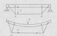 щими из горизонтальной затяжки, стоек и подкосов. Шпренгель-ная балка представляет собой статически неопределимую систему. За лишнее неизвестное в уравнениях деформаций принимается усилие затяжки Н, которое образуется при изгибе балки вследствие увеличения расстояния между точками АА. При этом момент в сечении балки