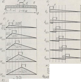 Рис. 18.19. К расчету балки пролетом 16 м: а—схема балки; б — линии влияния; в — наибольший момент М от подвижной нагрузки в разных сечениях; г — эпюра М от q; д — наибольший расчетный момент М от сил Р и q в разных сечениях; е — линии влияния поперечной силы Q; ж — наибольшие значения Q от подвижной нагрузки в разных сечениях; з — эпюра Q от q; и — наибольшие расчетные значения Q в разных сечениях