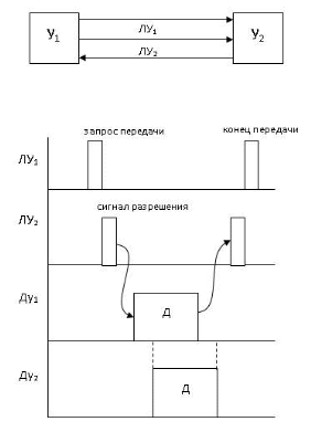 1. Синхронный метод. Сеанс связи между устройствами возможен только в течение времени, определяемым длительностью разрешающего сигнала синхронизации (УУ). Периодически УУ генерируется У1.