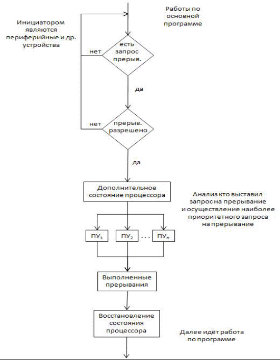 Режим прерывания поддерживается совокупностью программных и аппаратных средств , называемых контроллером прерываний программ. Источники запросов прерываний могут исходить от внешних устройств (т.как подтверждение запроса прерывания, сбой источника питания, затребование ПУ) и от внутренних (сбой ВС, переполнение разрядной стеки и т.п.).