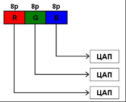 2. Формирование через таблицу цветов: в видеопамяти записывается таблица цветов, при этом в кодах пиксела записываются не атрибуты каждого составляющего цвета, а содержится адрес одной из настроек таблицы цвета, что обеспечивает простоту замены цвета без изменения команды пикселя. Содержимое регистров таблицы цветов может изменяться под управлением процессора. Блок формирования видеосигнала обеспечивает формирование значений напряжения, подаваемого на дисплей.
