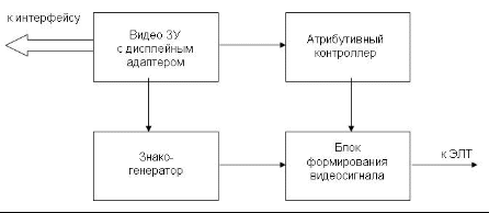 Коды атрибутов поступают на атрибутивный контроллер, где формируются атрибуты символа, и на генераторе видеосигнала формируются сигнал.