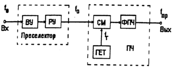 Преобразователем частоты (ПЧ) называется устройство для переноса спектра из одной частотной области (около рабочей частоты f0) в другую (около промежуточной частоты fпр) без изменения вида и характера модуляции Обычно ПЧ содержит нелинейный элемент (или элемент с переменным параметром), называемый смесителем, маломощный генератор высокочастотных колебаний, именуемый гетеродином, и избирательную систему на fпр в виде одного или нескольких колебательных контуров.
