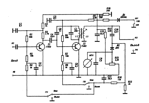 Детектор АРУ собран по параллельной схеме. Схема детектора включает полупроводниковый диод Д2 и нагрузку (C10, R15). Потенциометр R13 служит для подачи регулируемого напряжения задержки. Величина его контролируется измерительным прибором. Цепь R14, С11 является фильтром АРУ. Переключатели П1 и П2 служат для подачи регулирующего напряжения в базовые цепи транзисторов. Диод Д1 предохраняет транзисторы от пробоя при неправильном включении источника питания. Резисторы R10, R11 образуют делитель, позволяющий получить на его выходе напряжение -9В, необходимое для питания типовой схемы УПЧ.