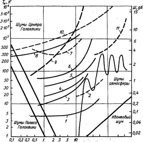 | Рис. 6.1 – Шумовые температуры и коэффициенты шума различных типов МШУ в зависимости от частоты: 1 – КПУ; 2 – УДП; 3 – ППУ охл. до 20К; 4 – УПТ охл. до 20К; 5 – ППУ охл. до 78К; 6 – ППУ неохл.; 7– УТД; 8 – УПТ неохл.; 9 – УБТ неохл.; 10 – ЛБВ; 11– смесители на ДБШ |
