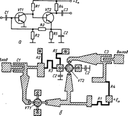 Схема двухкаскадного транзисторного усилителя на МПЛ (рис. 6.3) имеет параллельную (R3) и последовательную (R2, R5) обратные связи, стабилизирующие параметры усилителей. Резисторы R1 ... R5 выполнены по единой пленочной технологии.
