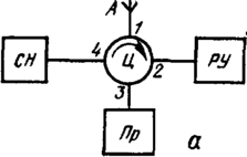 Сигнал из антенны А (рис. 6.2, а) поступает на вход циркулятора 1, усиливается в регенеративном усилителе (РУ), подключаемом ко входу 2; отраженная волна поступает от входа 2 ко входу 3, к которому подключается основной супергетеродинный приемник Пр. Отраженная от приемника (вследствие плохого согласования) волна поглощается согласованной нагрузкой СН, подключаемой ко входу 4. При хорошем согласовании нет необходимости в четвертом плече и можно ограничиться трехплечным или Y-циркулятором. При необходимости обеспечить более надежную развязку включают несколько (два – три) циркулятора, образующие пятиплечный циркулятор.