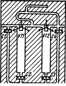 | +Еп | Емкости С2 порядка 70 пФ представляют собой проходные конденсаторы, соединяющие по СВЧ заземленную сторону платы с лицевой стороной через просверленные в керамике отверстия. |