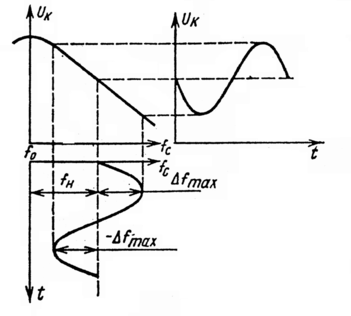 Промежуточное преобразование ЧМ сигнала в детекторе, схема которого показана на рис. 13.7, реализуется резонансным LC-контуром. В преобразователе используется наклонный участок АХЧ контура, где зависимость напряжения на контуре Uк от частоты f близка к линейной. Резонансная частота контура отличается от средней частоты сигнала на величину fН – рис.13.9. Такой преобразователь называют расстроенным относительно частоты сигнала контуром. При использовании наклонного участка АЧХ контура возникает сопутствующая амплитудная модуляция – рис. 13.8. Изменение амплитуды Uк напряжения на контуре соответствует закону изменения частоты входного сигнала. Напряжение с контура подается на амплитудный детектор, выходное напряжение которого функционально связано с мгновенной частотой входного сигнала EД = F(fс).