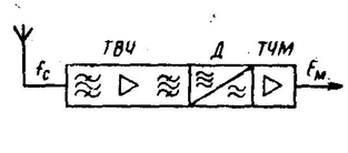 Принятый антенной радиосигнал с частотой fС поступает в тракт высокой частоты (ТВЧ), в котором осуществляются частотная избирательность и усиление, возможно преобразование частоты, амплитудная и временная избирательность. Детектор (Д) преобразует принимаемые модулированные сигналы в напряжение, соответствующее передаваемому сообщению. В тракте частоты модуляции fm (ТЧМ) реализуется последетекторная обработка сигналов: усиление, дополнительные преобразования для ослабления действия помех, декодирование и разделение сообщений (в многоканальных системах).