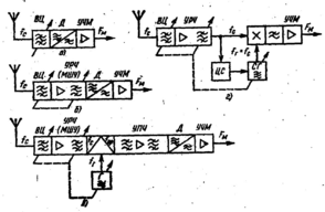 Супергетеродинный принцип (рис. 1.5, в) существенно улучшает качественные показатели РПрУ. Супергетеродинные приемники строятся на основе преобразования частоты принимаемого сигнала – переноса его в частотную область, где он может быть обработан с наибольшей эффективностью. Широкое распространение во всех радиодиапазонах получила построенная на этом принципе схема супергетеродинного приемника – рис. 1.5, в).