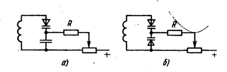 Варикапы включаются в колебательный контур – рис.3.9. Напряжение на диодах-варикапах регулируется потенциометром. Резистор R нужен для уменьшения шунтирующего действия на резонансный контур цепи управления настройкой. Недостаток варикапов в сравнении с конденсаторов переменной емкости – нелинейность при больших уровнях сигналов и помех. Повышать линейность можно применением балансных схем, например, встречно-последовательным включением двух варикапов – рис. 3.9, б).