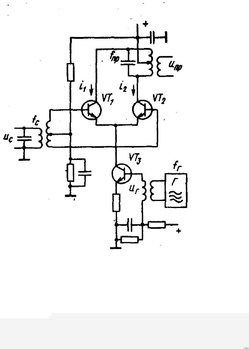 | Здесь используется метод переменной крутизны – на основе зависимости крутизны транзистора от тока эмиттера. Коллекторное напряжение на смесительные транзисторы VT1 и VT2 подается через среднюю точку катушки индуктивности выходного резонансного контура, настроенного на промежуточную частоту. Токи i1 и i2 транзисторов VT1 и VT2 через выходной контур текут в противоположных направлениях (встречное включение), и выходное напряжение пропорционально их разности. Напряжение гетеродина на смесительные транзисторы подано через транзистор VT3 синфазно. Поэтому токи i1 и i2 с частотой гетеродина, его |