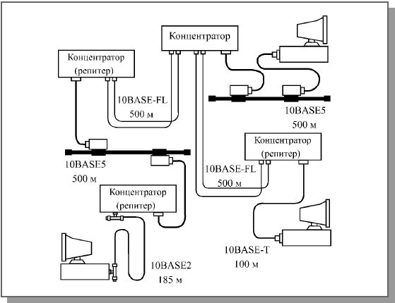 В частности, для конфигурации, показанной на рис. 1, путь наибольшей длины – это путь между двумя нижними по рисунку компьютерами. В данном случае это довольно очевидно. Этот путь включает в себя пять сегментов (слева направо): 10BASE2, 10BASE5, 10BASE-FL (два сегмента) и 10BASE-T.