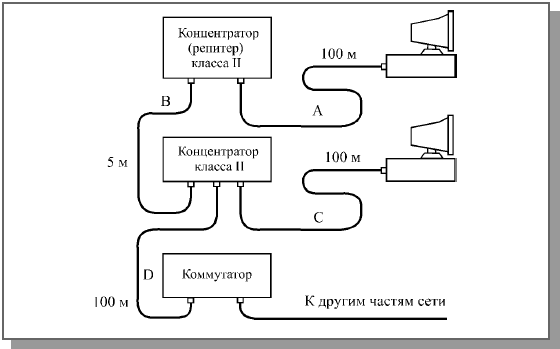 Данная сеть работоспособна. Но при этом надо учитывать, что каждый дополнительный концентратор класса II уменьшает общую допустимую длину кабеля на 92/1,112 = 82,7 метра. Сеть с четырьмя концентраторами не будет иметь смысла, так как на задержку в кабеле уже не остается почти никакого запаса (четыре концентратора дадут суммарную задержку в 92 * 4 = 368 битовых интервалов).