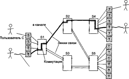 Чтобы объяснить основную идею коммутации каналов, рассмотрим ее в максимально упрощенном виде. Как показано на рис. 7, коммутационная сеть состоит из коммутаторов (SI, S2,..., S5), связанных между собой линиями связи. Каждая линия имеет одну и ту же пропускную способность.