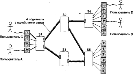 После того как сеть с коммутацией каналов была дополнена механизмом мультиплексирования, схема ее работы претерпела некоторые изменения. Запрос на установление логического соединения, переданный абонентом перед началом передачи, резервирует не целиком линии связи, а только их подканалы. Таким образом, соединение устанавливается не на уровне линий связи, а на уровне подканалов. Несколько подканалов используется в том случае, если пропускной способности одного канала оказывается недостаточно. Это дает возможность пользователю резервировать подканал (или подканалы), скорость передачи данных которого является максимально близкой к реально необходимой. Кроме того, мультиплексирование позволяет более экономно строить связи между коммутаторами. Действительно, для снижения вероятности отказов вместо нескольких линий связи теперь достаточно использовать одну физическую линию с большим количеством логических подканалов.
