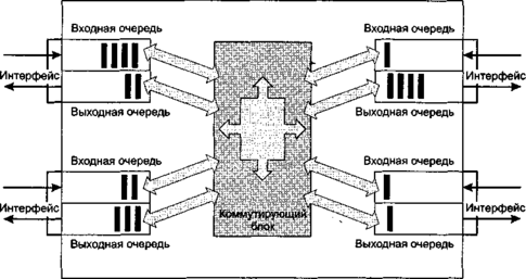 Буферизация необходима пакетному коммутатору также для согласования скорости поступления пакетов со скоростью их коммутации. Если коммутирующий блок не успевает обрабатывать пакеты, то на интерфейсах коммутатора возникают входные очереди. Очевидно, что для хранения входной очереди объем буфера должен превышать размер одного пакета. Существуют различные подходы к построению коммутирующего блока. Традиционный способ основан на одном центральном процессоре, который обслуживает все входные очереди коммутатора. Такой способ построения может приводить к большим очередям, так как производительность процессора разделяется между несколькими очередями. Современные способы построения коммутирующего блока основаны на многопроцессорном подходе, когда каждый интерфейс имеет свой встроенный процессор для обработки пакетов. Кроме того, существует также центральный процессор, координирующий работу интерфейсных процессоров. Использование интерфейсных процессоров повышает производительность коммутатора и уменьшает очереди во входных интерфейсах. Однако такие очереди все равно могут возникать, так как центральный процессор по-прежнему остается «узким местом».
