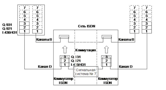 Одной из оригинальных идей, положенных в основу ISDN, является совместное использование принципов коммутации каналов и коммутации пакетов. Однако сеть с коммутацией пакетов, работающая в составе ISDN, выполняет служебные функции — с помощью этой сети передаются сообщения протокола