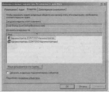 • Администраторы могут становиться владельцами. Пользователь из группы Админист­раторы (Administrators) или обладающий правом Смена владельца (Take Ownership) может получить во владение любой объект в системе.