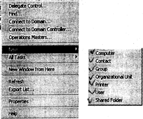 Логическую структуру определяет способ организации ресур­сов вне зависимости от их физического расположения. Каждому сетевому ресурсу соответствует объект, т. е. отличительный на­бор именованных атрибутов в каталоге. Однотипные объекты ло­гически группируются в классы. Классами могут быть домены, организационные подразделения, пользователи, группы, контак­ты, принтеры, разделяемые папки и компьютеры (рис. 7). Некоторые объекты (контейнеры), такие, как домены или организа­ционные подразделения, могут содержать в себе другие объекты.