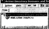 Active Directory создает иерархическое представление объектов Она расширяема, масштабируема и обладает распределенной системой безопасности. Active Directory применяет в качестве службы поиска доменную систему имен сети Интернет. DNS упорядочивает объекты в доменах в иерархию организационных подразделений OU (Organization Unit) и объединяет несколько доменов в древовидную структуру. Введение нового домена возможно с помощью оснасток Active Directory Domains and Trust (рис. 6).