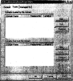 Доверительные отношения. Домены в дереве связывают ме­жду собой симметричные и транзитивные доверительные отно­шения по протоколу Kerberos. Транзитивность Kerberos означает, что если домен А доверяет домену В и домен В доверяет С, то это означает, что домен А доверяет домену С. Таким образом, все 3 домена доверяют друг другу. При вступлении нового домена в дерево доверительные отношения устанавливаются автоматиче­ски между ним и корнем родительского домена. На рис. 11 по­казано установление доверительных отношений в окне Trust осна­стки Active Directory Domains and Trust.