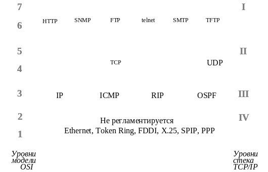 На рис. 4 приведена структура стека TCP/IP. Так как стек TCP/IP был разработан до появления модели ISO/OSI, то, хотя он также имеет многоуровневую структуру, соответствие уровней стека TCP/IP уровням модели OSI достаточно условно.