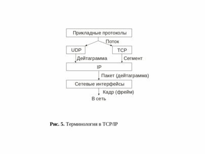 Каждый коммуникационный протокол оперирует некоторой единицей передаваемых данных. Названия этих единиц иногда закрепляются стандартом, а чаще просто определяются традицией. В стеке TCP/IP за многие годы его существования образовалась устоявшаяся терминология в этой области (рис.5).