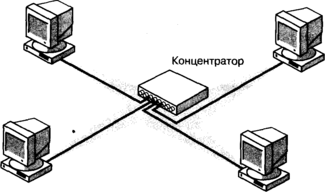 Основное преимущество топологии «звезда» в том, что у каждого компьютера имеется собственное соединение с концентратором. Выход из строя кабеля или разъема отражается на работе только одного компьютера. Недостатком топологии «звезда» является использование дополнительного оборудования — концентратора. При неисправности концентратора «падает» вся система. Однако случается такое довольно редко, т. к. концентратор — это относительно простое устройство, которое к тому же обычно устанавливают в закрытом помещении.