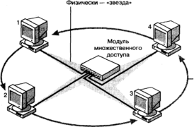 Рис. 4. В топологии «кольцо» физически кабели располагаются в форме звезды, а логически образуют кольцо