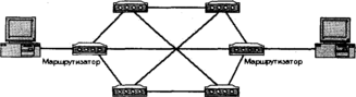 А вот в интерсетях ячеистая топология уже используется. В ячеистой интерсети благодаря использованию избыточных маршрутизаторов данные могут добраться от одной системы к другой несколькими путями (рис. 6). Эта топология часто применяется в крупных корпоративных сетях, поскольку она защищает их от неисправностей маршрутизаторов, концентраторов, кабелей и др. Чаще всего, когда говорят о ячеистой топологии, имеют в виду именно такое ее применение.