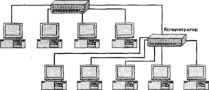 Рис. 3. В сети с топологией «иерархическая звезда» используется несколько концентраторов