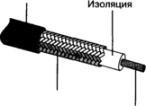 Рис.1. Коаксиальный кабель состоит из двух электрических проводов, разделенных слоем изоляции и заключенных в общую защитную оболочку
