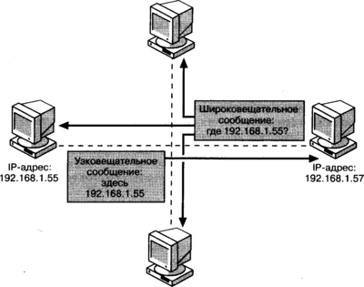Широковещательная передача — важная часть функционирования сети. Например, компьютеры определяют положение в ЛВС конкретной системы, передавая широковещательное сообщение с вопросом «Есть ли у какого-нибудь локального компьютера такой IP-адрес или такое NetBIOS-имя?» (рис. 3.2). По ответному сообщению система-отправитель устанавливает аппаратный адрес компьютера и далее отправляет ему нужные пакеты уже как узковещательные сообщения.