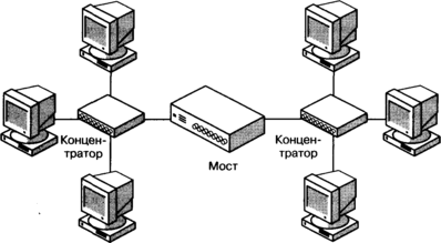 Мост (bridge) используется для соединения сетей на канальном уровне. Вы знаете, что концентраторы связывают сети на физическом уровне, даже не подозревая о существовании структур данных, обрабатываемых вышестоящими уровнями. Расширяя сеть путем включения в нее дополнительных концентраторов. Вы, по существу, достигаете такого же эффекта, как если бы заменили старый концентратор новым, с большим количеством портов. Каждый пакет, сгенерированный одним из компьютеров сети, все равно доходит до всех остальных компьютеров. Мост обеспечивает фильтрацию пакетов на канальном уровне, т. е. пропускает через себя только пакеты, предназначенные для участка сети по другую сторону моста. Если Ваша ЛВС из-за возросшего графика начала испытывать чрезмерные коллизии или просто стала медленнее работать, можно снизить трафик, разбив ее с помощью моста на две части.